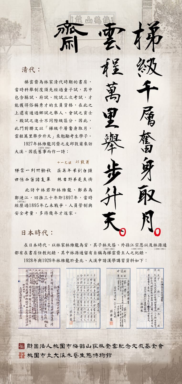 展出林家清代至日治時期的歷史,搭配書法對聯「梯級千層奮身取月,雲程萬里舉步升天」,展現林家人的志向與文采。